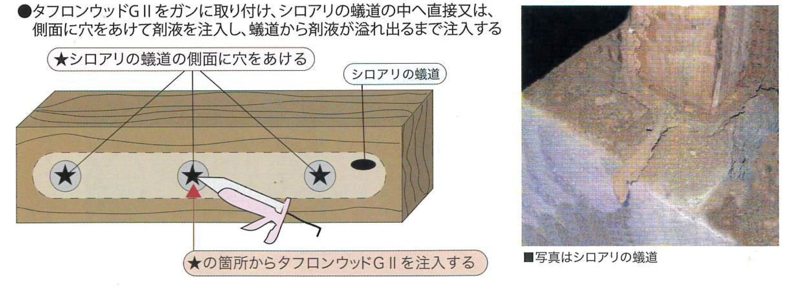 ■用途・・・●木部のひび割れに注入 ●白蟻の蟻道に注入 ●白蟻による木部の食害対策 ●木部の補強